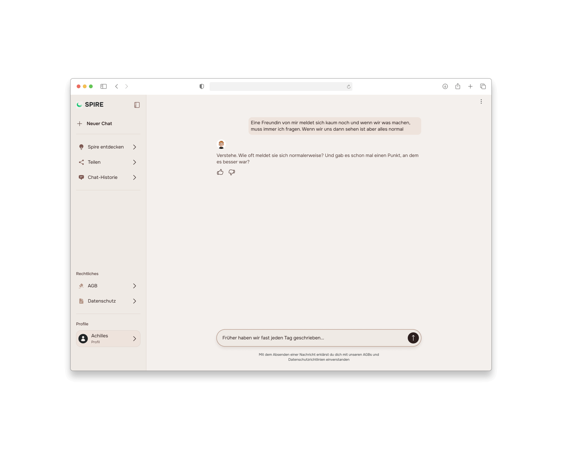 Mit der KI von SPIRE kannst du in einem geschützten Rahmen chatten. Ganz ohne Wertung, in einem “Safe Space”. Dabei hast du jederzeit die Kontrolle über deine Daten.